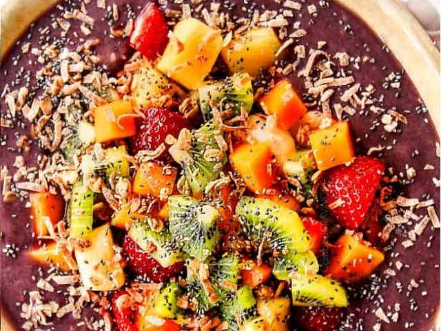 Pomislite na tropske kraje in si danes privoščite AÇAÍ skledico Tropical. Namesto domačih borovnic bomo v skledico dodali tropski Ananas. Za tekočino nam bo namesto mleka služil ananasov sok. Se vidimo na plaži :-).